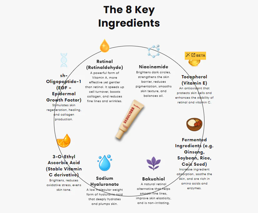 This product contains retinal encapsulated in liposomes, which improves stability and penetration. “4% retinal liposome” typically equals about 0.04% pure retinal—a gentle but effective dose for beginners